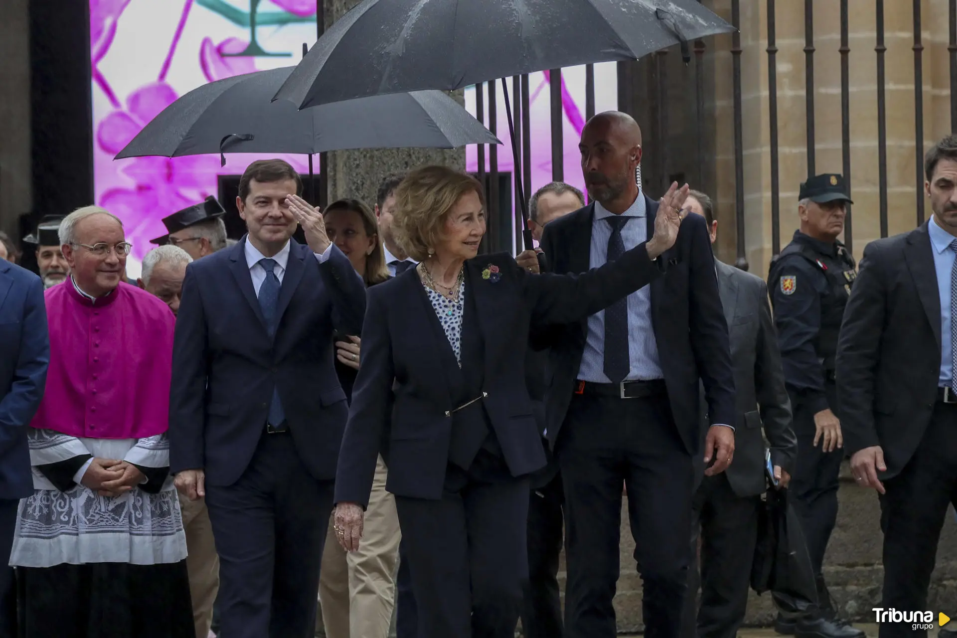 En la imagen, la Reina Sofía saluda a la puerta de la Catedral de Zamora en su visita con motivo de la exposición de Las Edades del Hombre (Foto EFE)