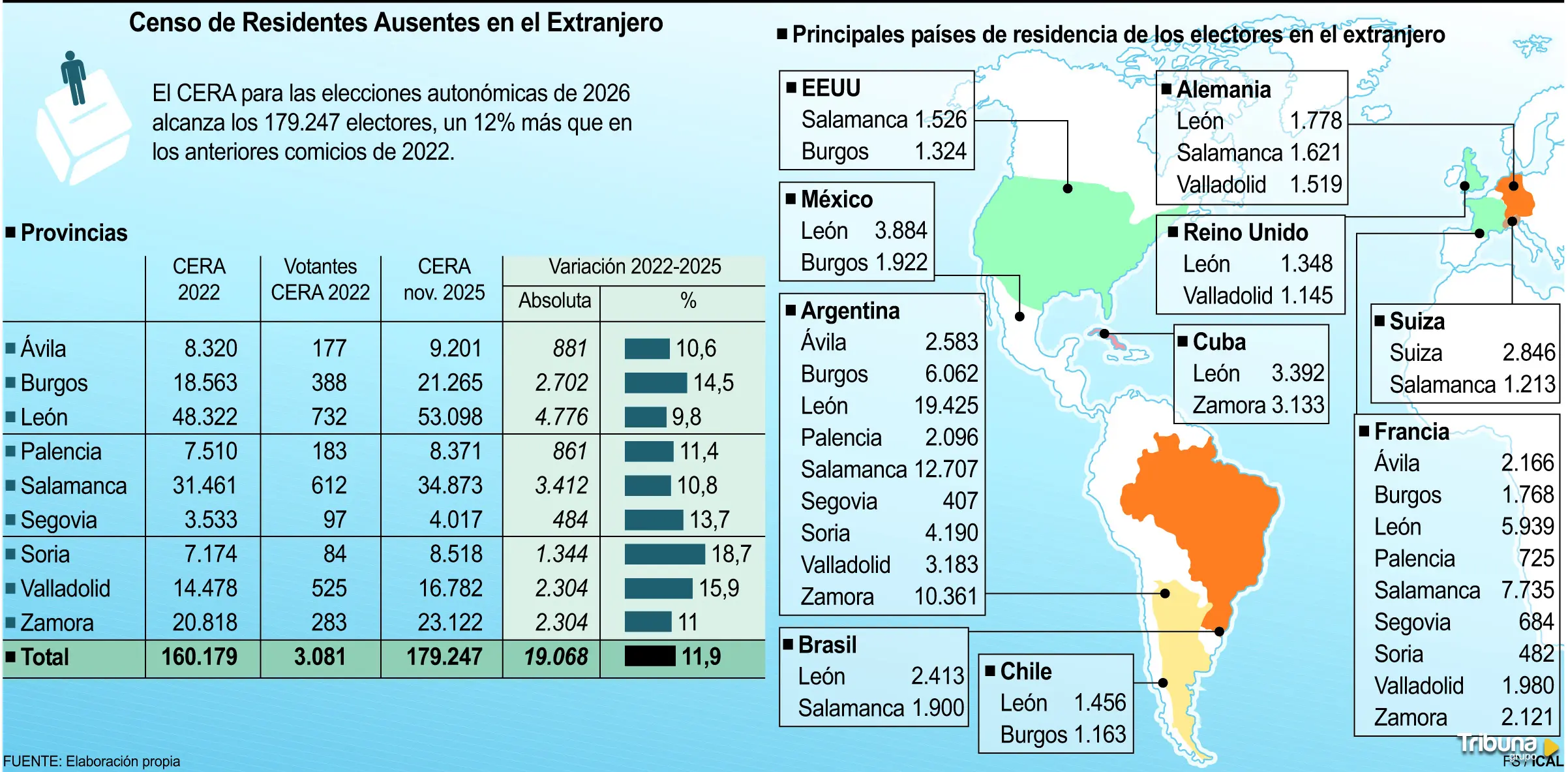 Las próximas elecciones autonómicas en Castilla y León a celebrar en 2026 contarán con un censo récord en el extranjero de 179.247 electores, lo que les convierte en la práctica en la décima provincia de la Comunidad. Además, por primera vez en estos comicios, no será necesario el voto rogado, lo que les allana el camino para que puedan también decidir el futuro de su tierra.